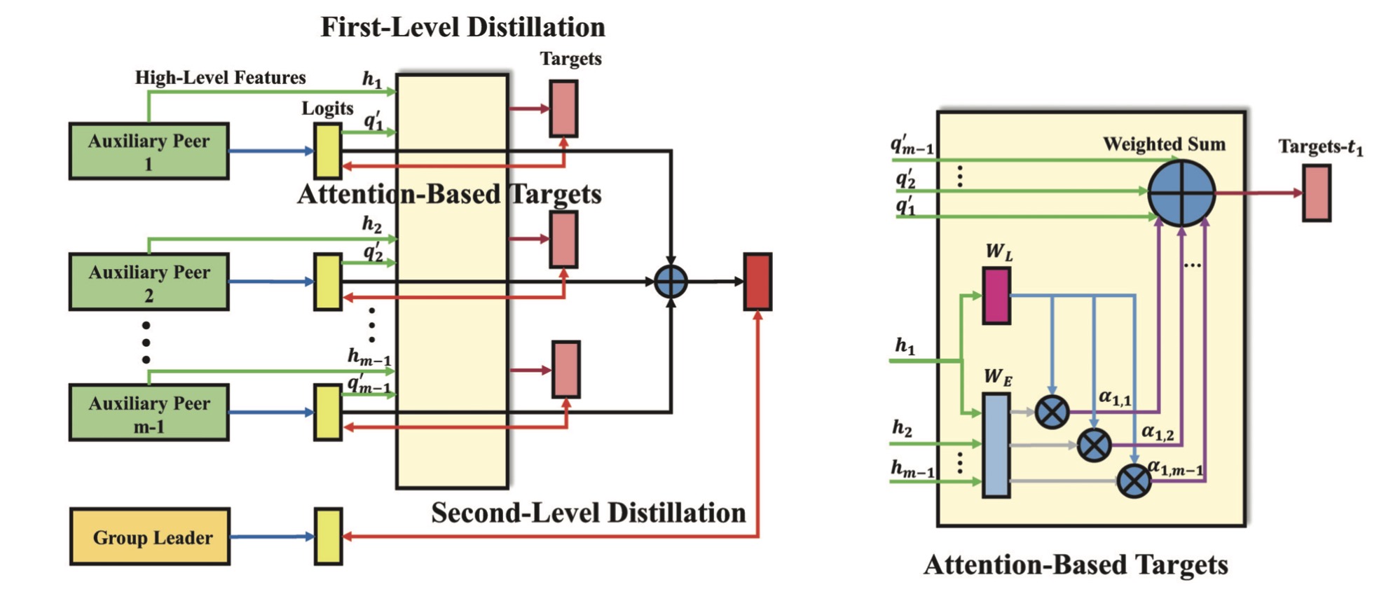 对于Online蒸馏方法,其可以通过使用多个学生模型的聚合中间预测作为目标来训练每一个学生模型,OKDDip方法通过两次蒸馏实现,其先提出一组peers来学习peers间的信息并进行第一轮蒸馏得到Soft Labels,之后再使用该Label对Group Leader进行第二轮蒸馏。
