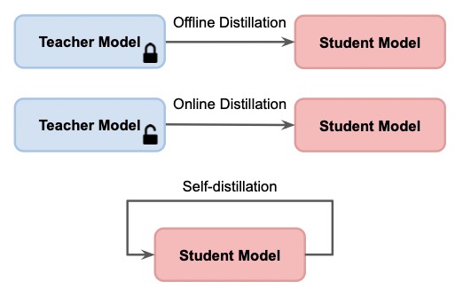 从模型蒸馏方式,可以将其分为3类:Offline Distillation, Online distillation 以及 self-distillation。